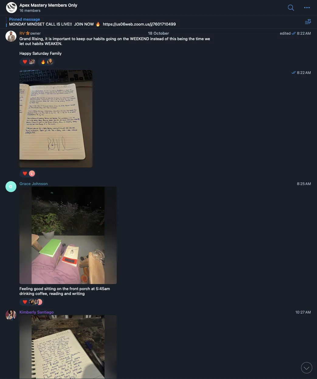 "Apex Mastery has been an absolute game-changer for me. The weekly training calls have been so much more than just motivational talks and inspiration — they’re deep, intentional, and truly transformative. These sessions have opened my eyes to the real power of mindset, thoughts, and vibrations.What I love most is how these calls don’t just feed you information — they challenge you to go inward with deep reflective questions. They’ve helped me reflect deeply on what I actually desire in life, and more importantly, why I’ve struggled to take action on the things I say I want. Through these trainings, I’ve realized that mindset mastery isn’t just about being positive — it’s about becoming self-aware, shifting limiting beliefs, and aligning with the higher version of myself.Apex Mastery bridges the gap between understanding and execution in such a powerful way. I’m excited for the version of me that’s still unfolding."